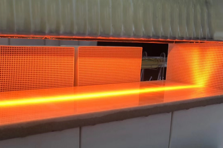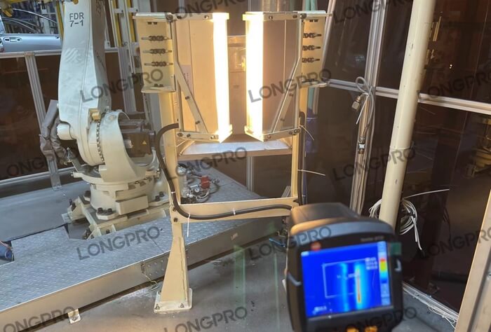 在待折彎的熱塑性預浸料板上進行紅外線快速預熱軟化,雙面加熱,以達到折彎所需工藝要求。利用線型聚焦加熱器(加熱器聚集成一條高溫加熱線)的低能耗,高光強,穿透力強,控制簡單等特點,通過上下布置,快速精準軟化所需的狹長區(qū)域,尤其帶有厚度的預浸料折彎加工。