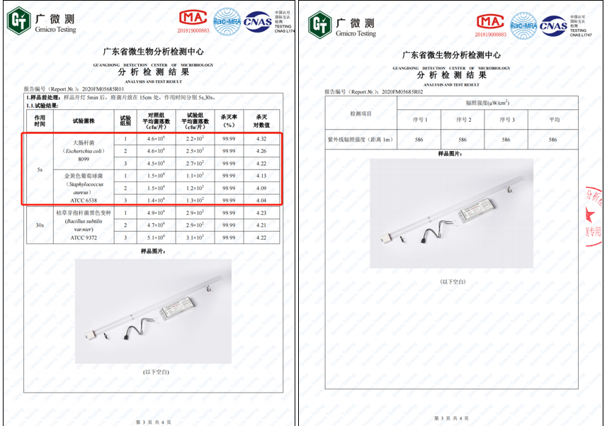 紫外光源第三方檢測報告:(輻照強度+殺菌率)